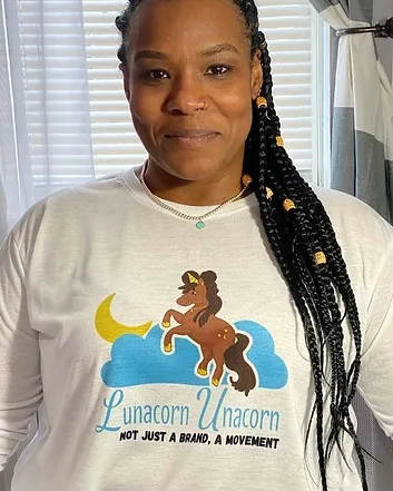 Lunacorn Unacorn is a brown-skinned unicorn who has afro puffs, locs and coarse hair. She is an emotional support animal that speaks life into children impacted by trauma. Lunacorn encourages children by speaking positive affirmations to them .