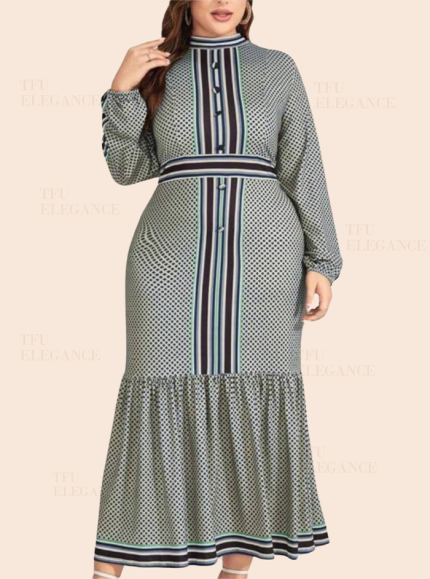 Touch From You Elegance Plus Size Women’s Stand Collar Striped Ruffle Hem Dress