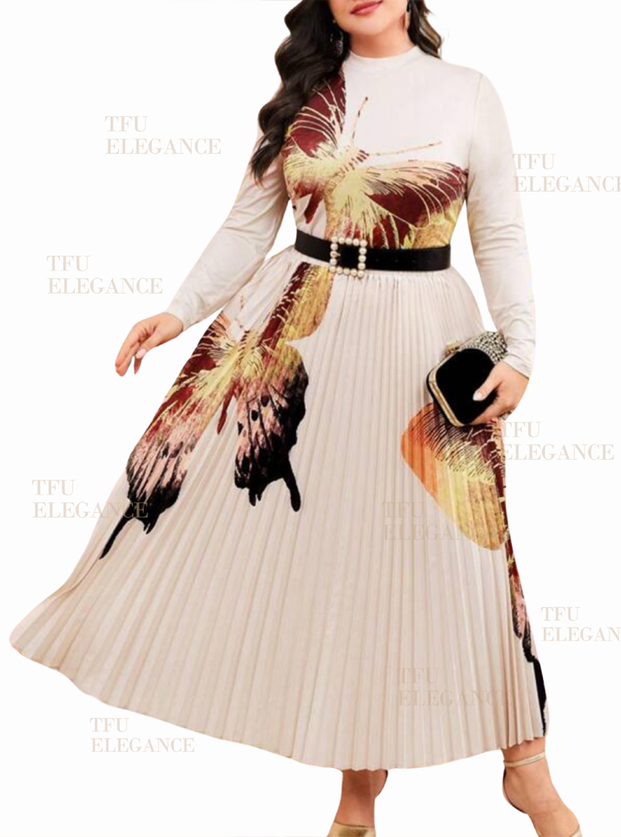 Touch From You Elegance Plus Size Women’s Butterfly Printed Long Sleeve T-Shirt And Pleated Skirt