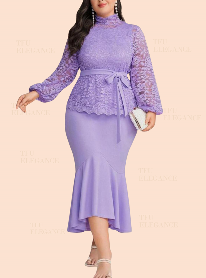 Home CURVY PLUS Touch From You Elegance Plus Size Women’s Stand Collar Lace Lantern Sleeve Top And Skirt Purple