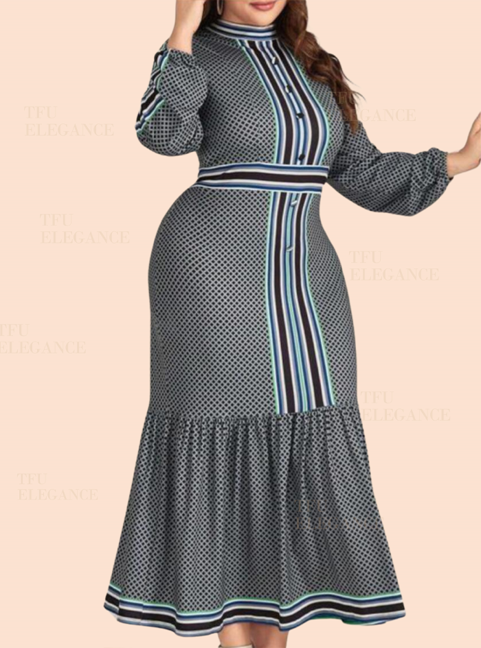 Touch From You Elegance Plus Size Women’s Stand Collar Striped Ruffle Hem Dress