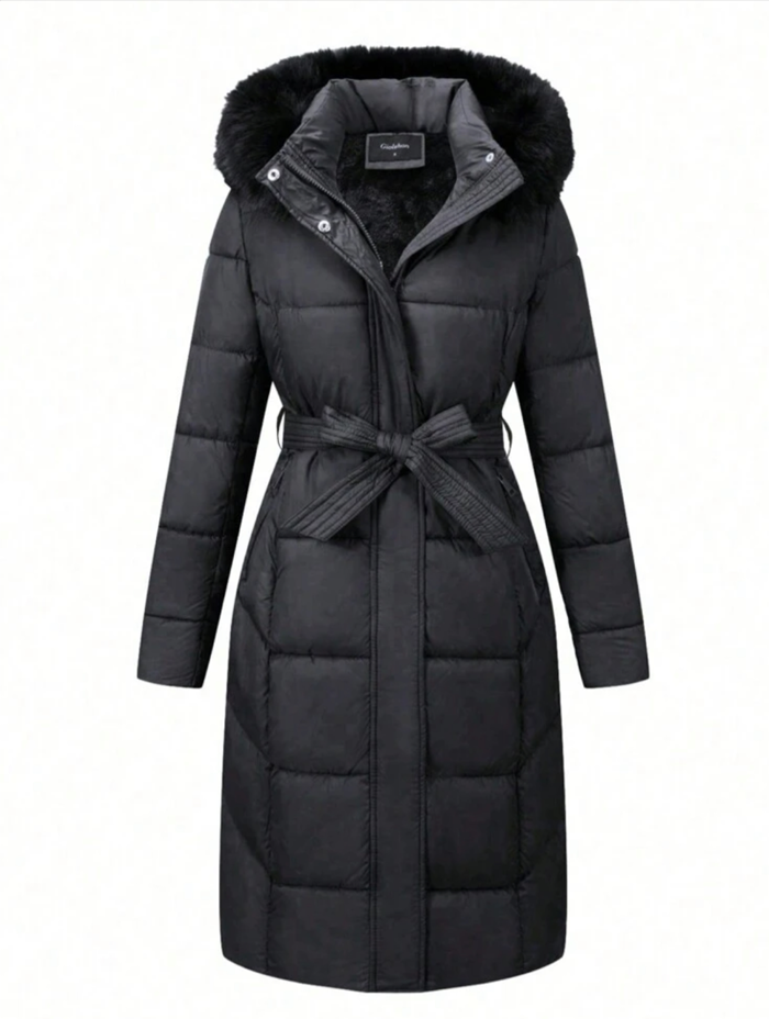 Home Women Coats Jacket Women’S Simple Style Mid-Length Hooded Padded Jacket With Belt For Fall/Winter